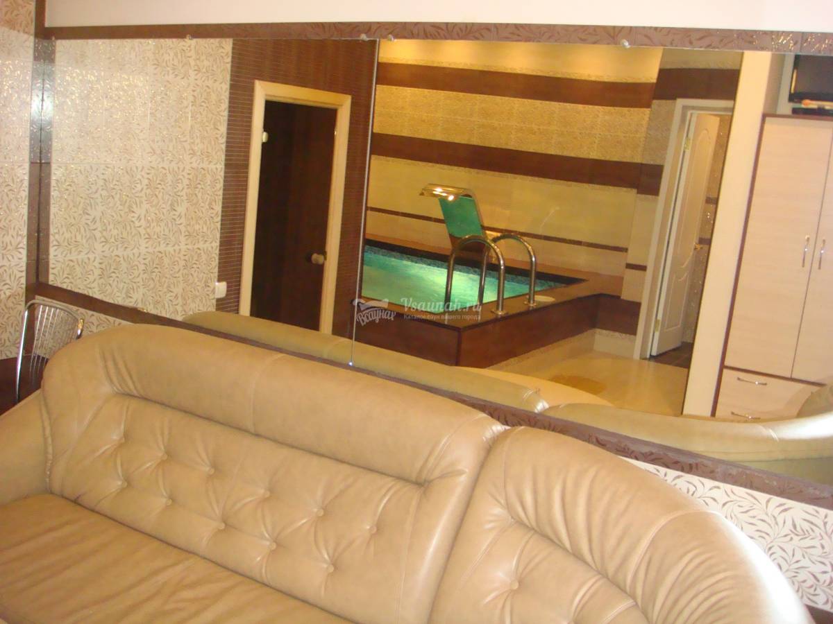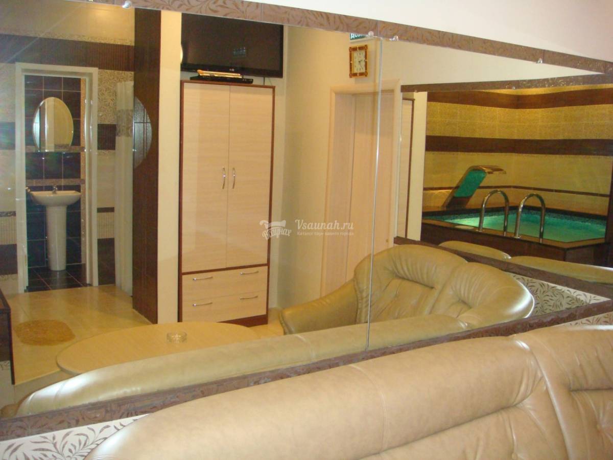 К Вашим услугам три уютных номера, 6-местный + бассейн 24 м2, парная финская и русская с вениками, 4-местный + бассейн 12м2, парная финская и русская с вениками и 2-х местный без бассейна, инфракрасная сауна. А так же: комнаты отдыха, ТV, DVD, караоке, бар, банные принадлежности: веники, эфирные масла, простыни, полотенца, тапочки.